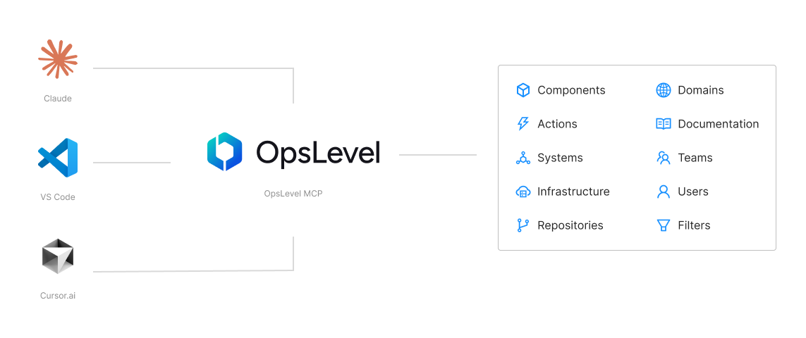 OpsLevel makes it easy to give your LLM tool of choice access to your production software architecture, relationships, docs, and more!